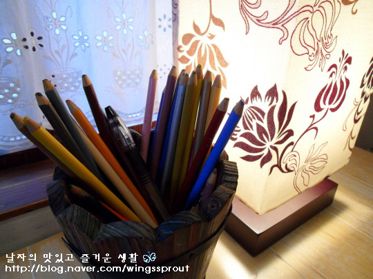 테이블에는 색연필과 스탠드.