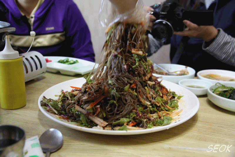 일회용 장갑을 끼고 오시는 아주머님...그러더니 거침없이 막국수를 비벼주시는데?