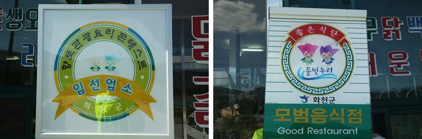 음식점 입구...엥? 이건 뭐어? 오호라아? 여기 화천군 모범음식점이래?