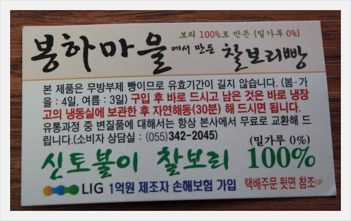 신토불이 찰보리쌀로 만든빵이라고 합니다. 찰보리,계란,우유,팥으로 만들고 방부제가 들어가지 않습니다.