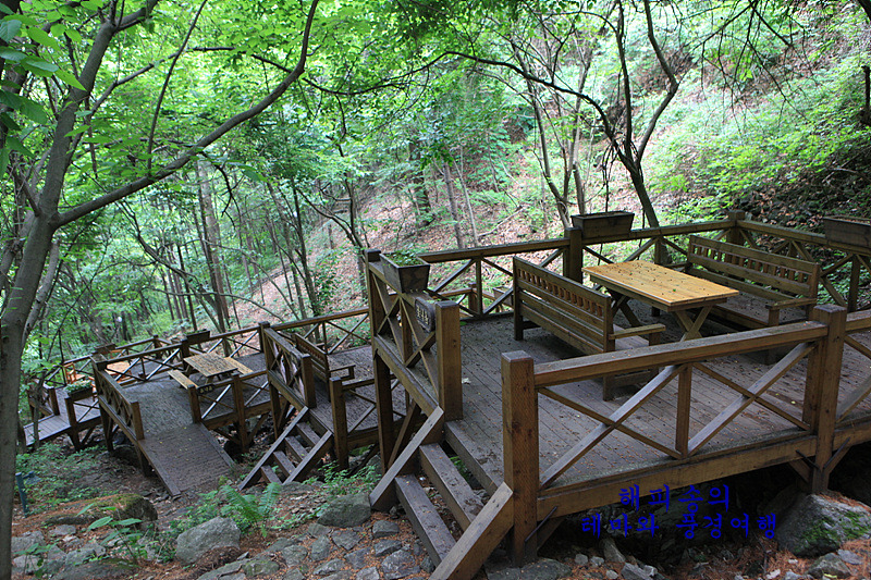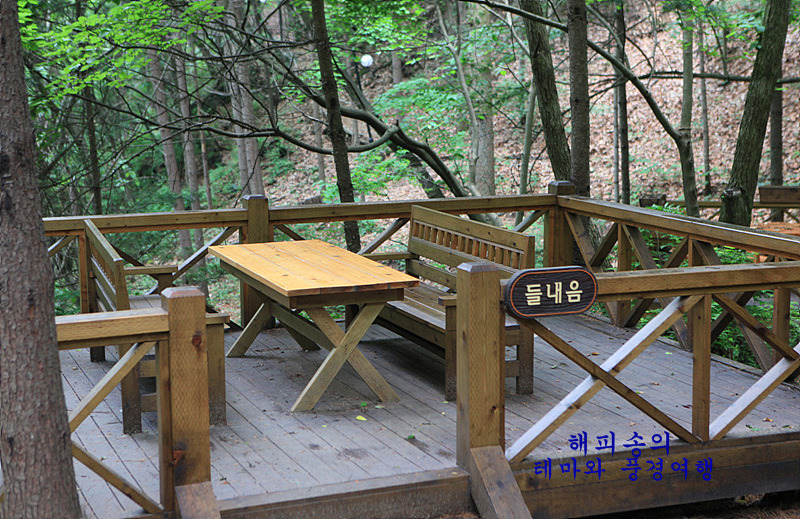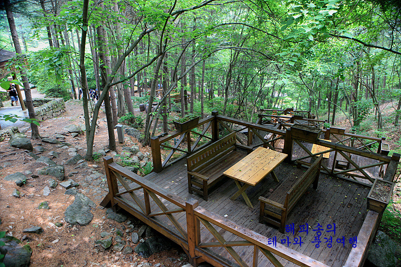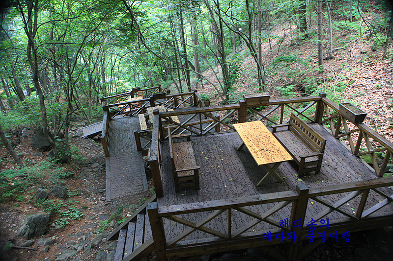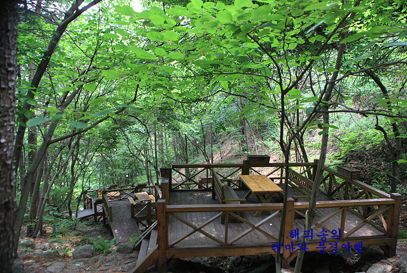 계곡위에 데크를 만들고 그위에 야외 테이블이 놓여 있었다.