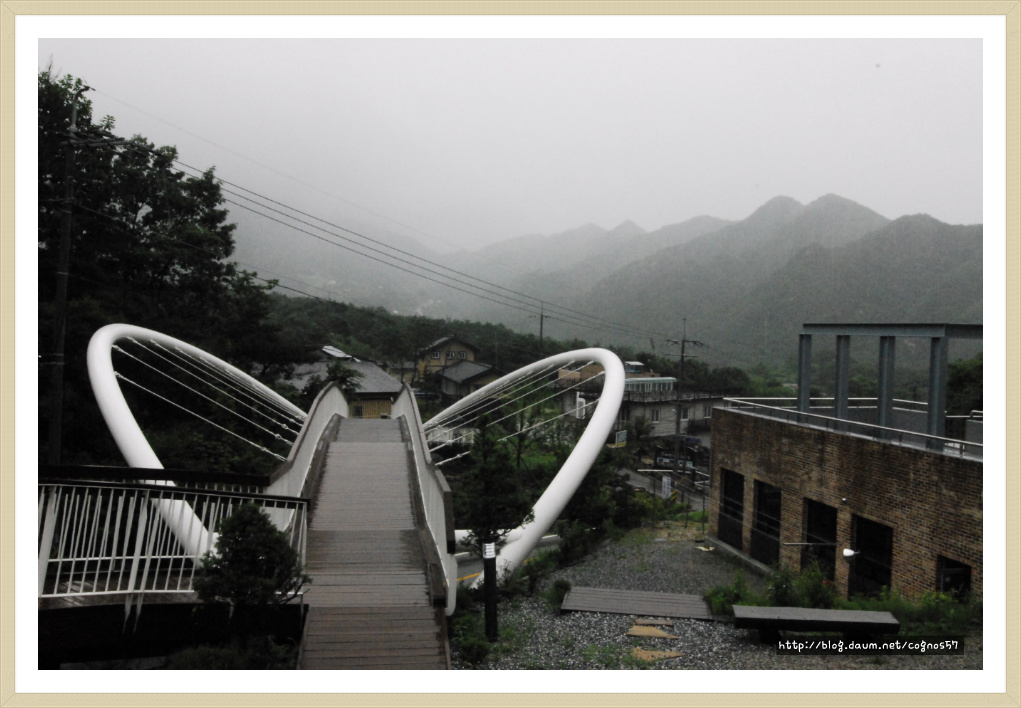 비가 내리는 산야초마을 둘러 싸고 있는 산봉우리들이 아름답습니다.