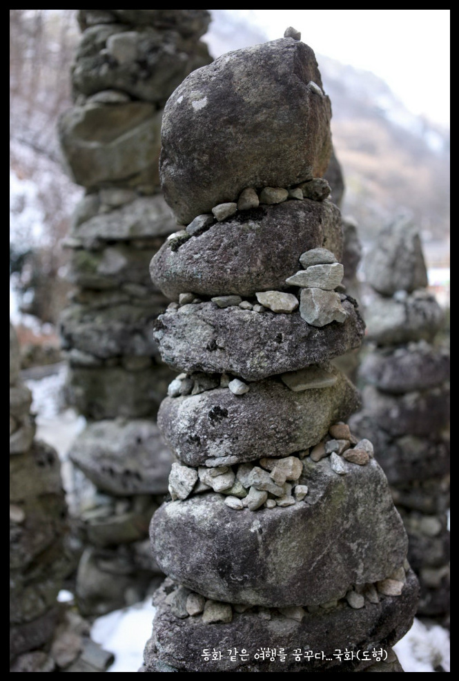돌에 돌을 포개얹어 크고 작은 외줄 돌탑을 80여개 쌓아 만든 석탑들이