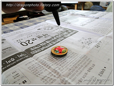 꽃과 잎이 놓인 나무판에 UV수지를 덮습니다.