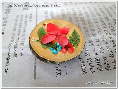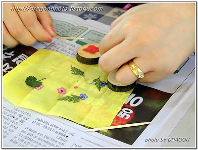 압화된 꽃과 잎의 뒷면에 본드를 살짝 칠하고 이쑤시개로 나무 판위 적당한 위치에 놓습니다.