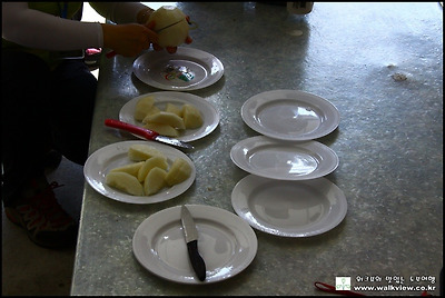 체험한 배르 가지고 접시에 담아 나누어 먹습니다