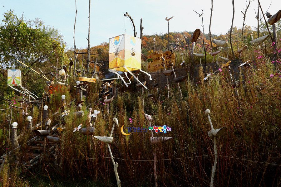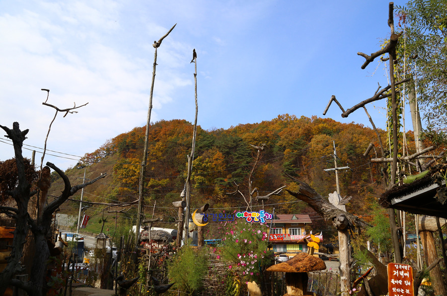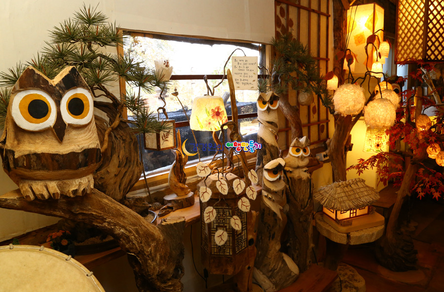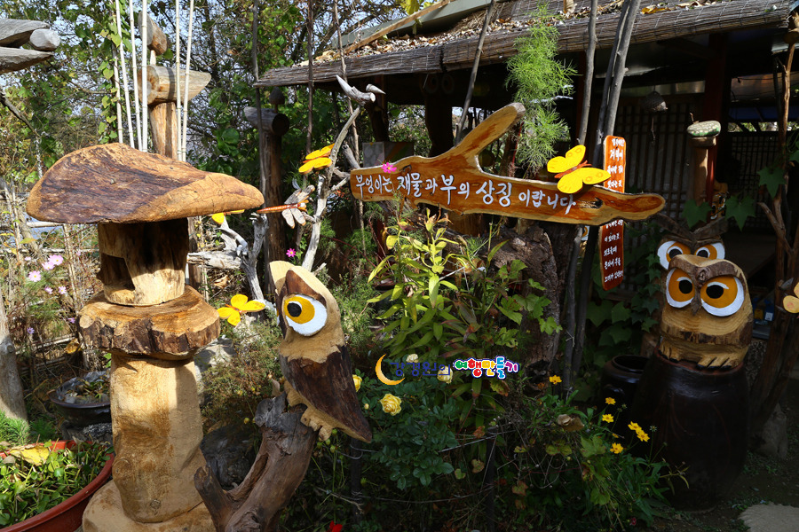 심마니공방 들어가는 계단 에는 오돌개마을의 체험중 하나인 솟대들이 자리잡고 있는 그뒤로 부엉이 조각이 큰눈을 부릅뜨고 서있는데 팻말에 ‘부엉이는 재물과 부의 상징 이랍니다’ 라는 글이 적혀 있어 더 눈길이 간다.