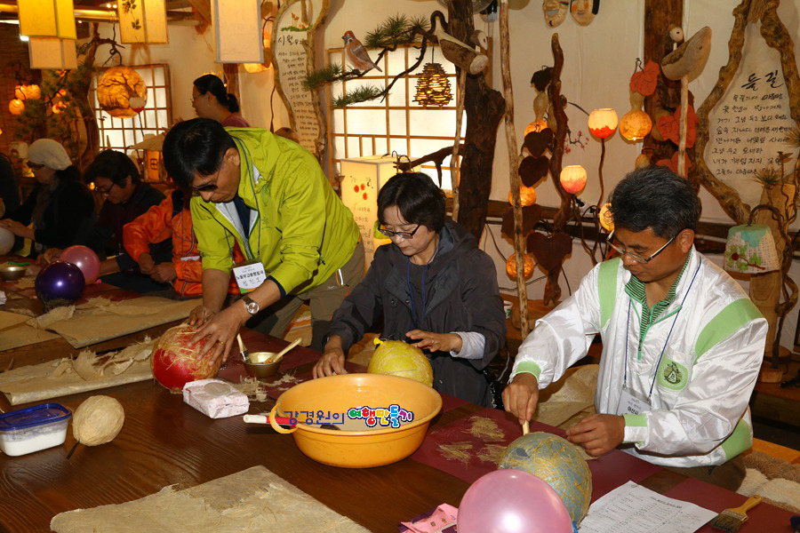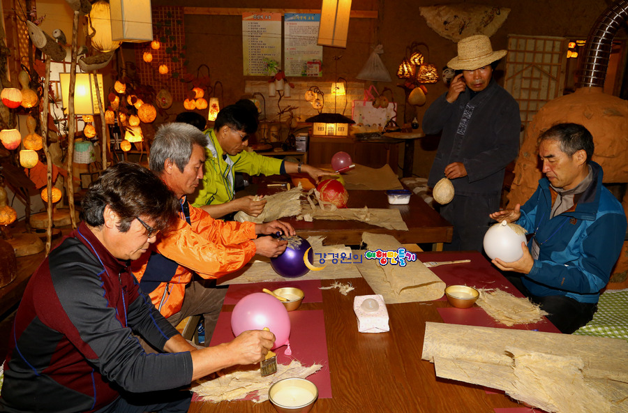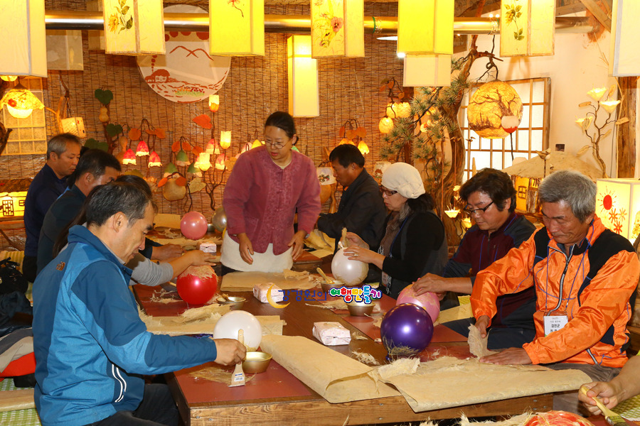 심마니공방 한지공예는 우리나라 고유의 종이인 닥나무로 만든 한지로 한지등만들기 체험이 진행되는데 풍선을 불어 그위에 풀을 이용하여 한지를 붙인후 한지가 마르면 등으로 탄생하는 신기한 장면이 사람들을 감탄하게 만든다.