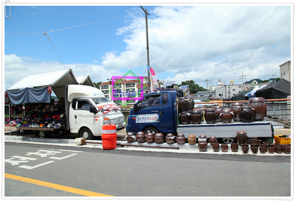 아직은 좀 이른시간. 현풍천을 끼고 도로가에도 장이 펼쳐집니다. 현풍백년도깨비전통시장 장날에 출동한 고령 전통옹기 판매차량의 모습이네요.