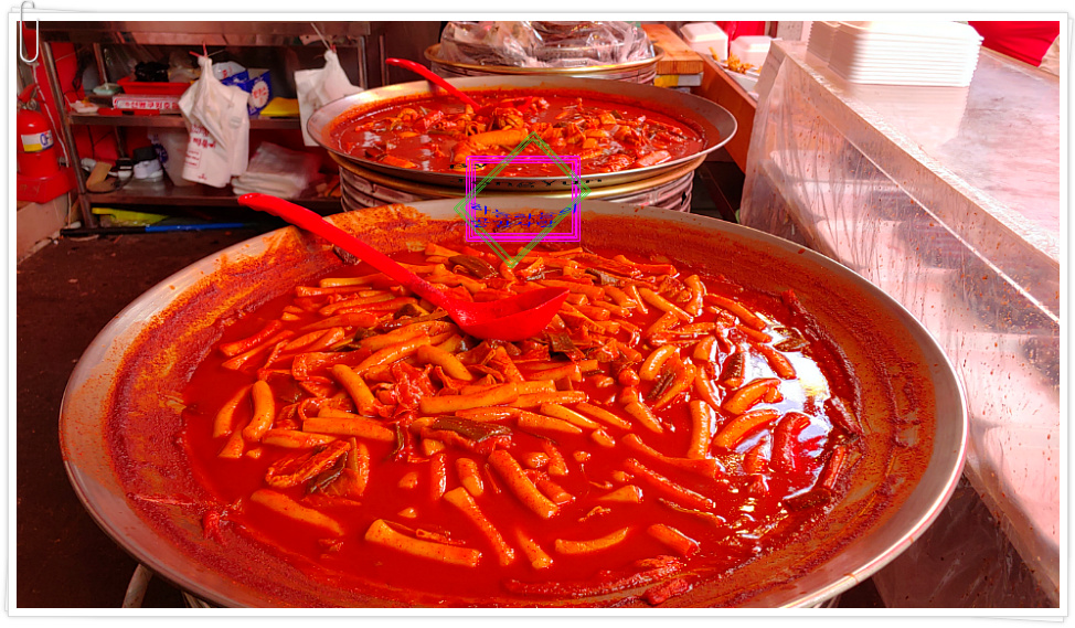 시장골목에 빠질 수 없는 먹을거리 간식은 떡볶이와 튀김 그리고 김밥이지요. 장날을 맞아 많은 떡볶이가 준비된 분식집,