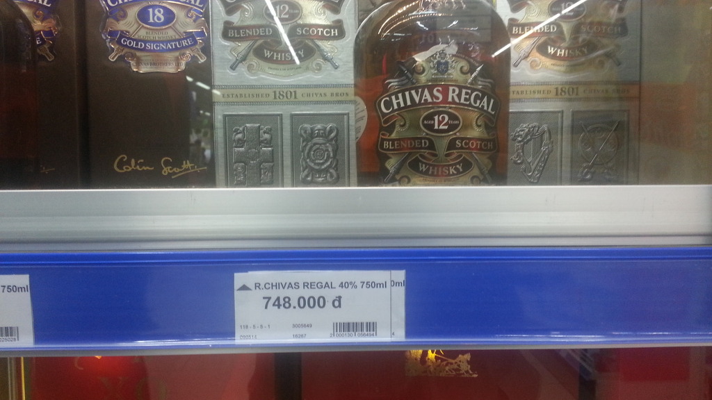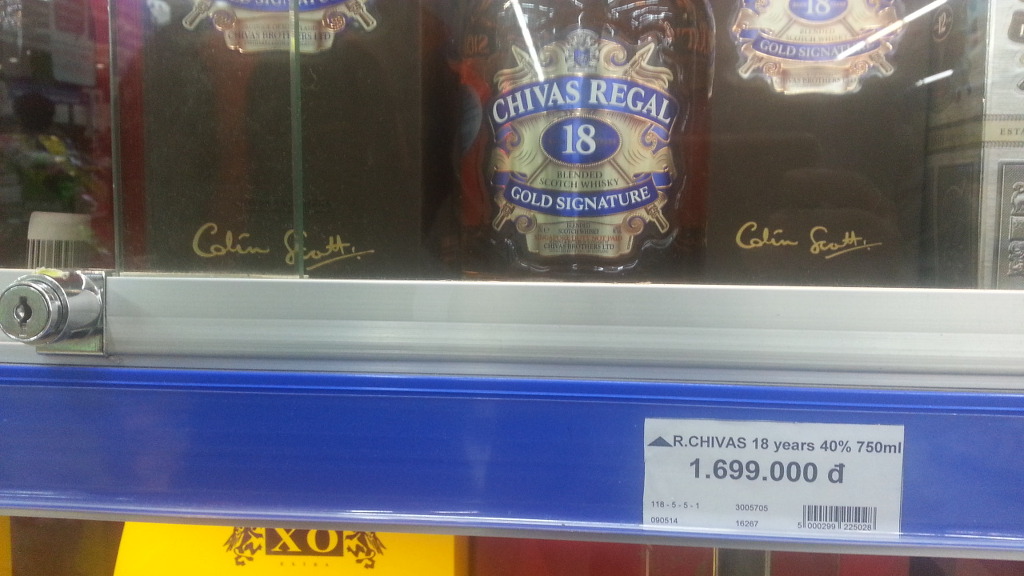 시바스리갈 18년산 750ml 1,699,000 dong (85,000원), 시바스리갈 12년산 750ml 748,000 dong (37,500원), 그 외에도 조니워커, 꼬냑 등이 즐비한다. 입국할 때 면세점에서 구입하면 오히려 바가지?