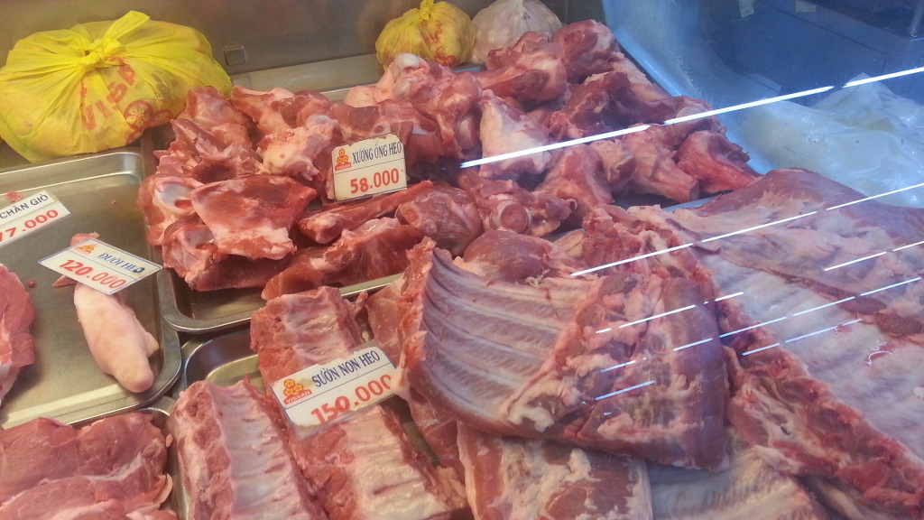 베트남 사람들이 잘 먹는 돼지 순살코기 소시지 500g 75,200 dong (3,800원), 베트남 재래식당에서 파는 덮밥 20,000 dong (1,000원)위에 슬라이스 2조각이 꼭 들어가는 소시지