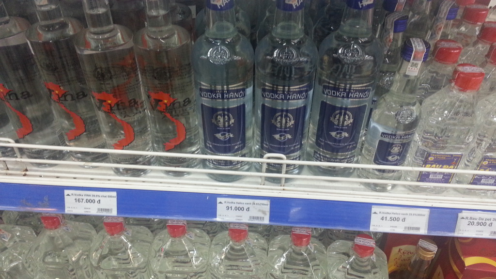 초코렛 진열대를 지나면 보드카 매장. 제일 잘 팔린다는 보드카 하노이 750ml 43도 91,000 dong (4,600원) 소주의 절반가격보다도 싸다. 역시 술을 즐기는 베트남 사람! 베트남 사람들은 처음에는 맥주로 시작해서 점점 독한 술로 나중에는 보드카나 위스키로 입가심한다. 한국과는 정반대.