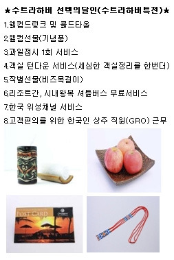 ※갈라디너안내:갈라디너는 특정일 호텔에서 의무로 규정하는 식사로 해당일 모든 투숙객들이 지정된 레스토랑에서 식사를 합니다. 수트라하버리조트 갈라디너의 날짜와 금액은 아래와 같습니다. 2월14일:$45/인(아동은$22.5)[출발전 지불] 유류할증료 불포함 (2009년 9월 1일 인상분) *출발전 입금부탁드립니다.
