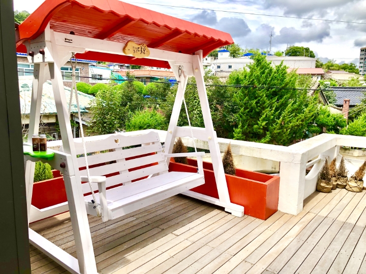 테라스 그네의자에 앉아