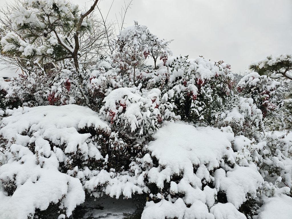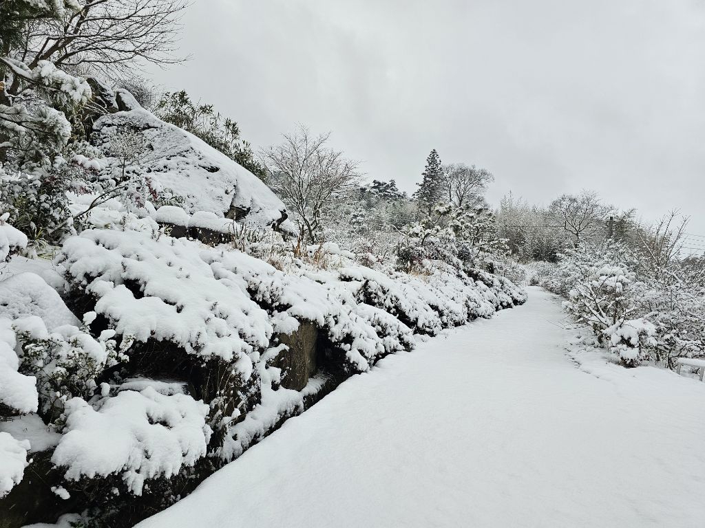 나무와 화초들은 눈의 무게로 가지가 살짝 숙여져 있고