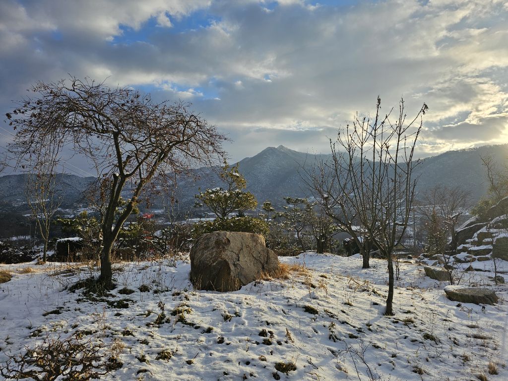 농원 주변의 산과 들판도 눈으로 덮여 환상적인 풍경을 만들어냅니다.