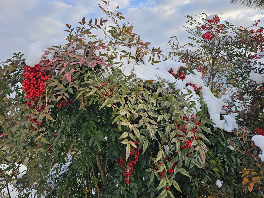 알맞게 물든 남천과 피라칸사 등은 머리에 얹은 빨간 열매들을 뽐내고 있습니다.