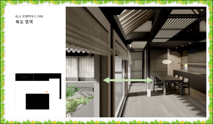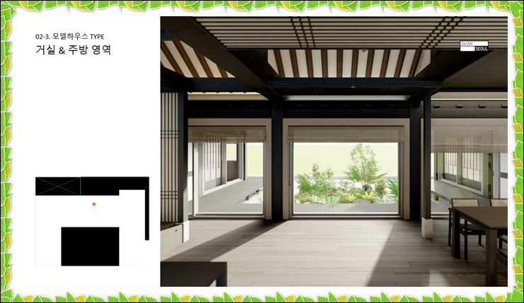 게다가 기존 전통가옥의 단점인 단열기능이 보완된 시공 공법으로 특허도 받았다고 하니 더 따스하겠습니다. 프라이버시 보호를 위해 3m 높이의 옹벽으로 시야를 차단합니다. 초입에 관리사무소가 설치되어 외부인이나 차량이 통제되며 주택별 AI시스템이 적용될 예정입니다.
