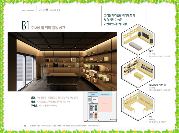 지하층은 주차장과 취미활동공간으로 구성하였는데요, 썬큰을 설치하여 자연채광이 들어오도록 설계하며 지하는 용적률에 포함되지 않아서 더 여유롭게 사용할 수 있습니다. 차량은 최대 4대까지 주차가 가능하며 취미실로 영화관, 서재, 작업실 등 고객의 취향에 맞게 맞춤제작이 가능하도록 가변적 시스템이 적용된답니다.