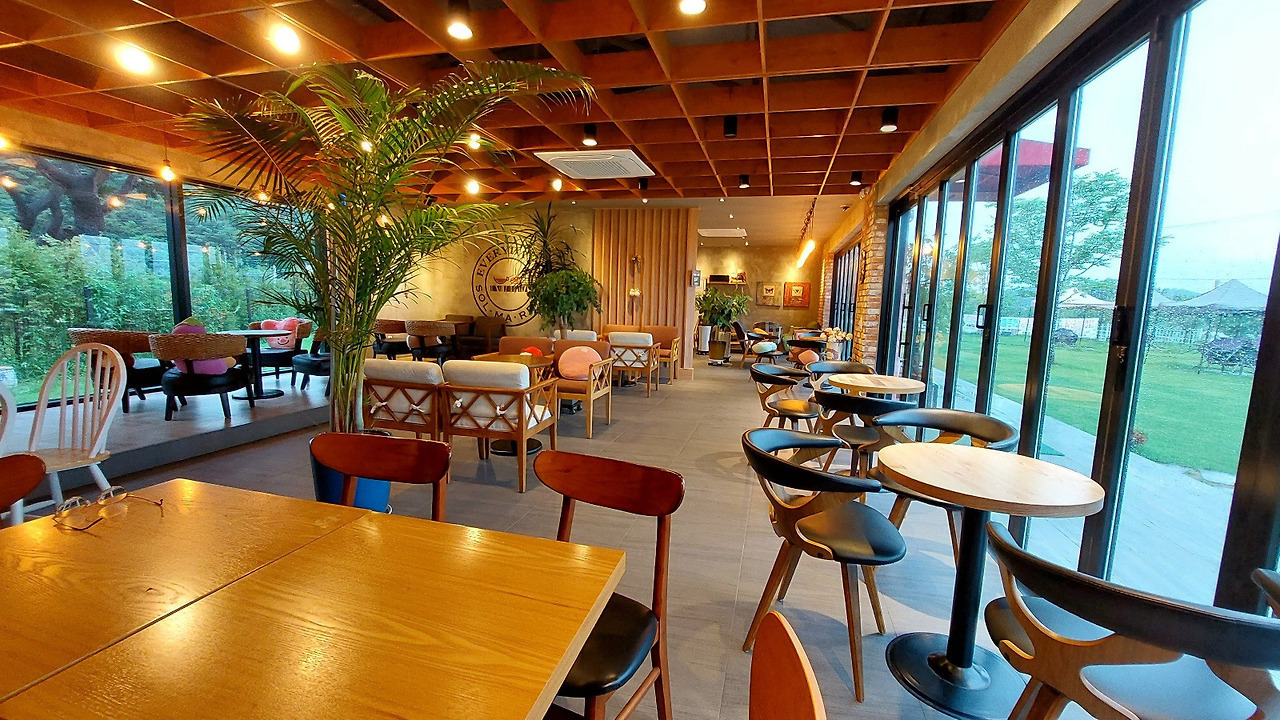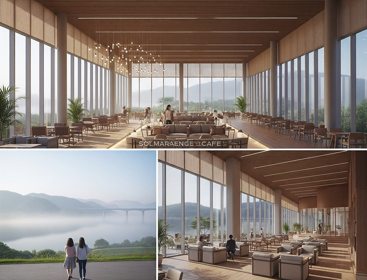 강릉 '테라로사'처럼 높은 층고와 복층 구조, 넓은 야외 테라스, 조경, 산책로, 포토존 등을 설계하여 단순한 카페를 넘어 '복합 문화 경험'을 제공하는 랜드마크 대형 카페 구현이 충분히 가능합니다. 소양강의 아름다운 풍경과 어우러져 지역의 명소가 될 것입니다.