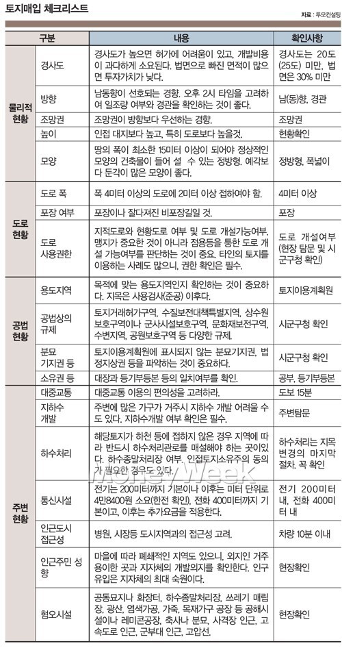| 부동산 투자에 있어서 토지는 환금성이 낮은 축에 속한다. 한번 사두면 적게는 3~4년에서 길게는 20년 이상 보유하는 게 다반사다. 주택에 비해 거래가 많지 않은 데다 규격화되지 않은 탓에 매매가 쉽지 않다. 단기 투자관점에서 보면 토지는 그다지 매력적이지 않다. 뛰어난 안정성도 금융위기 이후 담보할 수 없게 됐다. '묻어두면 무조건 돈 된다'던 토지투자의 불문율 역시 이때 이후 종적을 감췄다. 더 이상 안전한 투자처가 아니게 됐다는 의미다. 사진_자료제공 가평군청 ◆적극적인 토지활용 늘어 토지가 더 이상 안전자산으로 분류되기 어려워짐에 따라 최근 토지 투자 트렌드는 '수익형' 성향이 강해졌다. 땅을 활용한 임대상품을 개발하거나 직접 수익사업을 운영하는 사례가 늘고 있다. 캠핑 열풍에 힘 입어 각광을 받고 있는 토지 투자는 캠핑장 임대사업이다. 구입한 토지가 휴양객을 유치할 수 있는 경관을 보유하고 있다면 카라반이나 오토캠핑장으로 활용하고 일정수입을 올리는 방식이다. 식수시설과 매점 등 간단한 요건만 갖추면 사업을 할 수 있다는 점도 매력적이다. 외국인을 대상으로 한 임대사업도 토지를 적극 활용하는 방법이다. 렌탈하우스나 한옥마을을 조성해 임대수익을 챙기는 경우다. 직접 집을 지어야 하지만 한옥의 경우 정부지원이 많아 부담이 덜하다. 과거엔 토지를 임대해주고 임대료를 챙기는 소극적인 임대사업을 했다면 최근에는 직접 창고를 짓고 임대해 수익률을 높이기도 한다. 또 유실수나 관상수를 토지에 심어 분양하거나 전체를 넘기는 방식으로 수익을 거두는 사례도 늘었다. 부동산전문 모 대표는 "부동산투자의 패러다임이 주상복합에서 아파트, 다시 연립주택에서 오피스텔 식으로 변화속도가 빠르다"며 "이런 빠른 패러다임의 변화를 싫어하고 어려워하는 투자자들이 토지투자를 통해 수익형 모델을 고려하는 추세"라고 설명했다. ◆토지투자 체크리스트는 토지는 전문성이 없다면 위험도가 큰 투자상품이다. 반드시 현장을 가보고 도로 여건 등을 따져봐야 한다. 구입 경로는 크게 세가지다. 지역 부동산에 문의해 구입하거나 토지전문가에 의뢰하는 경우, 경매를 통한 방법 등이다. 모두 리스크가 있지만 우선 토지에 대한 기본지식이 필요하다. 등기부등본 상에 명시돼 있는 내용의 의미를 이해할 수 있을 정도는 돼야 토지투자의 기본을 갖췄다고 볼 수 있다. 그렇다면 토지 구입 시 기본적으로 체크해야 할 점은 어떤 것이 있을까. 우선 접근성을 따져봐야 한다. 직선거리보다는 접근거리(차량거리)가 중요하다. 고속도로 인터체인지나 국도 또는 지방도에서 목적지까지 얼마나 소요되는지 파악해야 한다. 의료시설과 면사무소, 할인매장, 터미널 등의 주요시설이 목적지와 얼마나 가깝고 이동시간이 얼마나 소요되는지도 내비게이션을 활용해 체크해보자. 목적지 인근에 차량을 세우고 두발을 이용해 목적지까지 걸어가 보자. 전답 혹은 임야를 구입한다면 걷는 동안 토질을 확인하는 기회가 생긴다. 해당 토지에 이르면 도로의 접근성 및 도로포장 여부, 도로를 통한 사람과 차량의 통행 여부와 빈도수를 확인한다. 맹지인 경우 건축허가 여부에 따라 땅의 가치가 달라지기 때문에 포기하지 말고 도로를 낼 수 있는 지를 집중적으로 파고드는 것이 중요하다. 일반인이 풍수지리학적으로 명당을 찾기란 쉽지 않다. 그럴 때 쉽게 판단할 수 있는 기준은 해당 부지와 주변 토지의 상호연계성이다. 공장이나 창고가 많은 지역이나 축사 및 돈사가 많은 지역은 주택으로 적합하지 않다. 산과 강, 하천의 조망이 가능한 지역인지도 확인해보자. 현장답사가 필요한 이유는 이론상과 현황상 토지의 차이점을 확인할 수 있어서다. 경치와 토속음식에 취하기보다 땅의 위치와 경계, 형상, 방향 등 기본현황은 물론 보이지 않는 권리까지 분석해야 한다. 지적도(임야도)와 지번도, 나침반을 함께 구비한다면 도움이 된다. 좋은 공기와 물은 전원생활의 기본적인 자원이다. 반경 1~2km 이내에 공동묘지나 화장장, 하수종말처리장, 쓰레기 매립장, 광산, 대규모 축사, 염색가공·가죽·목재가구공장, 레미콘공장 등이 있다면 전원주택지로는 낙제점이다. 전기와 전화선 조달은 필수 점검사항이다. 반경 200m 이내에 마을이 있다면 문제가 되지 않지만 마을에서 떨어져 있는 외진 개울가나 산속이라면 비용이 많이 발생하기 때문에 타당성을 검토해야 한다. 특히 물의 조달은 절대적이다. 목적토지 인근에 상수도가 있는지, 만일 지하수를 팔 경우 식수량은 풍부한지를 점검해야 한다. 주변이 개발되면서 물 부족사태를 경험할 수 있고 지하수맥을 찾지 못해 낭패를 보는 사례도 있다. 식수량이 부족하면 이웃간 분쟁이 발생할 수도 있다. 이장이나 지역 유지들을 탐문하면 알 수 있는 내용이다. 모 대표는 "현장답사에서 마을이나 지역의 호감도, 지자체의 인구 유치를 위한 노력 등까지 점검하면 좋다"면서 "답사 전 무엇을 확인할 것인지 체크리스트를 작성하는 것이 좋다"고 충고했다.- 불황돌파구 '느리게'/ 20년 뒤를 보는 토지투자법 |