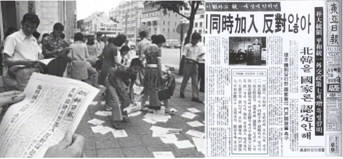 | 🌳73년 박정희 대통령 `6ㆍ23선언` 발표 1973년 6월 23일 남북의 정상이 정반대의 성명과 연설을 발표했다. 박정희 대통령은 UN동시가입을 골자로 하는 6.23특별성명을 발표했고 같은 날 김일성 주석은 고려라는 국호로 남북연방제를 실시하고 UN에 단일의석으로 가입하자는 것이었다. 1972년 7.4공동성명이 발표되었고 남북조절위원회와 적십자회담이라는 두 갈래의 남북대화가 진행되고 있던 점을 고려하면 이는 사실상 대화 결별 수순과도 같았다. 6.23특별성명은 외견상 박대통령의 입장이 전향적으로 바뀌었음을 보여주고 있다. 1960년대까지 한국정부의 입장은 대한민국이 한반도의 유일합법정부이고 이는 UN이 보증하고 있으며 북은 UN결의를 무시하고 한반도 북부지역을 강점하고 있는 불법단체였다. 이 논리대로라면 북과의 교류. 협상은 물론 한국정부의 법적 정통성의 뿌리가 되는 UN에 북이 가입하는 것도 용납할 수 없는 것이다. 그러나 박대통령은 1972년 7.4공동성명에서 북과 협상했고 6.23선언에서는 국제사회에 남북이라는 두개의 정치적 실체가 존재함을 인정했다. 6.23선언의 UN동시가입안은 박대통령의 안이었다기 보다는 미국의 요구였다. 힘의 열세에 직면한 미국이 동아시아 정책을 전반적으로 조정하면서 미중수교, 미군철수, 일본역할 증대, 남북 긴장완화로 이어지는 질서 재편의 한 고리가 UN동시가입이었다. 이렇기 때문에 박대통령은 7.4공동성명에서 북과 대화협상하면서 남북의 국호 명기를 거부했고 6.23선언을 발표하면서도 “북한을 국가로 인정하는 것이 아니다”라고 못박았다. 그리고 6.23에 대한 북의 반응은 단일국호 UN가입이었다. 북은 7.4공동성명에서 “외세에 의존하지 않고 외세의 간섭을 받음이 없이” 자주적으로 해결하자고 한 만큼 UN으로 문제를 가져가지 말라는 것이고 UN에 가져가려면 단일국호로 연방제를 시행한 후에 하자는 것이다. 6.23 성명을 통해 박정희 대통령은 7가지 제안을 한다. 1) 조국의 평화적 통일은 우리 민족의 지상 과업이다. 우리는 이를 성취하기 위한 모든 노력을계속 경주한다. 2) 한반도의 평화는 반드시 유지되어야 하며, 남북한은 서로 내정에 간섭하지 않으며 침략을 하지 않아야 한다. 3) 우리는 남북 공동 성명의 정신에 입각한 남북 대화의 구체적 성과를 위하여 성실과 인내로써 계속 노력한다. 4) 우리는 긴장 완화와 국제 협조에 도움이 된다면 북한이 우리와 같이 국제기구에 참여하는 것을 반대하지는 않는다. 5) 국제연합의 다수 회원국의 뜻이라면 통일에 장애가 되지 않는다는 전제 하에 우리는 북한과 함께 국제 연합에 가입하는 것을 반대하지 않는다. 우리는 국제 연합 가입 전이라도 대한 민국 대표가 참석하는 국제연합총회에서의 「한국문제」토의에 북한측이 같이 초청되는것을 반대하지 않는다. 6) 대한 민국은 호혜 평등의 원칙 하에 모든 국가에게 문호를 개방할 것이며, 우리와 이념과체제를 달리하는 국가들도 우리에게 문호를 개방할 것을 촉진한다. 7) 대한 민국의 대외 정책은 평화 선린에 그 기본을 두고 있으며, 우방들과의 기존 유대관계는 이를 더욱 공고히 해 나갈 것임을 재천명한다. 다만 언급한 바와 같이 발표의 말미에서 이 조치는 잠정적인 것이며 북한을 국가의 실체로 인정하는 것은 아님을 명백히 했다. “나는 이상에서 밝힌 정책 중 대북한 관계 사항은 통일이 성취될 때까지 과도적 기간 중의 잠정 조치로서, 이는 결코 우리가 북한을 국가로 인정하는 것이 아님을 분명히 하여 둡니다.”라고… | |