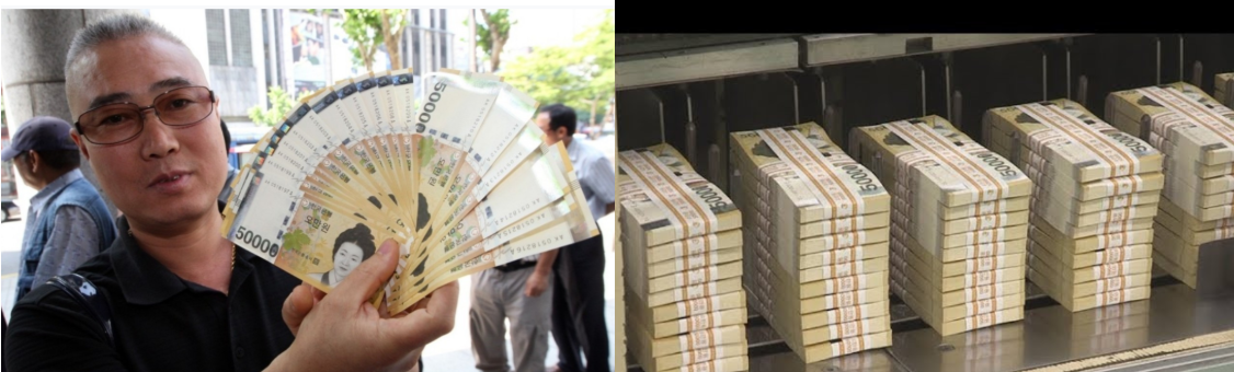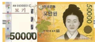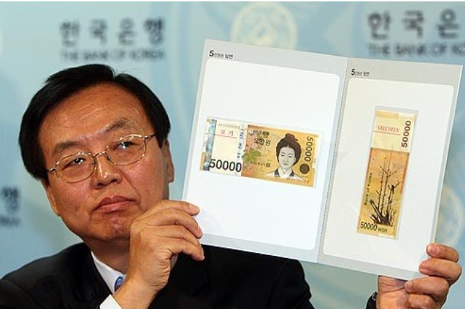 | ✿2009년 6월 23일 5만원권 지폐 유통 한국은행은 2009년 6월 23일 오전 6시부터 금융기관 본점과 결제모점(한은과 입출금 거래하는 지점)에 5만원권을 공급했다. 이날 발행번호 2만1번부터 100만 번까지의 5만 원권이 시중은행, 특수은행, 지방은행 본점과 우정사업본부 등을 통해 유통되면서 이들 금융회사의 영업창구는 5만 원권을 찾는 고객들로 분주했다. 이처럼 교환 수요가 몰린 영업점에서는 고객이 길게 줄을 늘어서는가 하면 일부 지점은 아예 1인당 신권 교환 금액을 100만원으로 제한했다. 이내황 한국은행 발권국장이 5월 25일 오전 서울 소공동 한국은행에서 금년 6월중 발행할 5만원권 도안을 공개하고 있다. | |