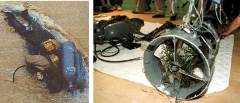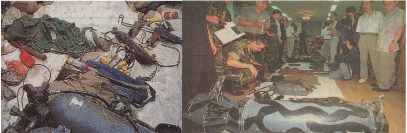 | 🌲98년 무장간첩 시체 발견 1998년 7월 12일 ...무장간첩 시체가 발견된 동해시 부근 해역에서 발견된 수중추진기. 1983년 북한이 사용하기 시작한 수중 추진기는 유도탄모양으로 3~5명이 올라 타거나 매달려 수중-수상으로이동할 수 있는 장비이다. 잠수복 차림에 기관단총을 휴대한 북한 무장간첩 시신 1구와 침투용 수중 추진기 1대가 12일 오전 9시20분께 강원도 동해시 어달동 해변에서 발견됐다. | |