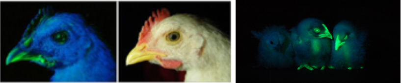| ✿2004년 ‘형광닭’ 유전자 변형 성공, 치료용 단백질 대량생산 길 열려 해파리의 녹색형광유전자(GFP)가 삽입된 닭은 평상시에는 여느 닭과 마찬가지(오른쪽)이지만, 어두운 곳에서 자외선을 비춰주면 부리와 머리 부분이 밝은 녹색을 띠게 된다. 국내 연구진이 몸에서 형광색 빛이 나는 유전자 변형 닭을 처음으로 개발, 달걀을 통해 인체에 유용한 단백질을 대량생산할 수 있는 길을 열었다. 대구가톨릭대 의대 김태완(金泰完·49) 교수는 해파리의 녹색형광유전자(GFP)를 닭에 주입, 평소에는 부리나 털이 여느 닭과 다를 바 없지만 어둠 속에서 자외선을 비추면 밝은 녹색을 띠게 하는 데 성공했다고 12일 밝혔다. 형광유전자는 유전자 변형이 제대로 됐는지를 확인하는 데 이용한다. 유전자 변형을 마친 뒤 자외선을 비춰 형광색을 띠면 GFP와 함께 주입한 다른 유전자도 제대로 기능을 발휘하는 것으로 볼 수 있기 때문이다. 김 교수는 “이번 연구는 닭에 원하는 유전자를 집어넣을 수 있다는 것이 확인됐다는 의미를 갖는다”며 “앞으로 달걀에서 사람의 조혈촉진단백질이나 혈액응고단백질과 같은 고가의 치료용 단백질을 저렴하게 생산해낼 수 있을 것”으로 기대했다. 김 교수가 닭에 주목한 것은 알에서 깨어나는 데 21일밖에 걸리지 않고 6개월만 자라면 다시 알을 낳을 수 있는 데다, 달걀을 구성하는 단백질이 간단해 분리해 내기가 쉽기 때문이다. 과학자들은 치료용 유전자가 주입된 닭이 이른바 ‘생물 제약공장’이 될 것으로 기대하고 있다. 이번 연구는 충남대 형질전환복제돼지 연구센터와 건국대 이훈택 교수, 축산기술연구소 장원경 박사 연구팀과 공동으로 진행됐다. 연구결과는 이 분야 전문저널인 ‘생화학, 생물물리 연구’ 7월 23일자와, ‘분자 생식과 발달’ 8월호에 발표될 예정이다. | |