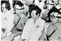 | 🌲80년 계엄사 합수부, 김대중 등 9명 내란음모 및 국가보안법 위반혐의 구속 내란음모혐의로 구속된 김대중씨(오른쪽에서 두번째)와 문익환씨(왼쪽). 계엄사 합동수사본부가 1980년 7월 12일 김대중씨 등 9명을 내란음모 및 국가보안법, 반공법, 외환관리법 위반 그리고 계엄포고령 위반 등 혐의로 육본계엄보통군법회의 검찰부로 구속 송치했다고 발표했다. 김대중씨 등과 같은 혐의로 송치된 사람들은 문익환 이문영 예춘호 고은 김상현 이신범 장기표 심재권 등이었다. 원심과 항소심에서 사형을 선고받은 김대중씨에 대해 대법원은 1981년 1월 23일 그에 대한 상고를 기각하고 사형을 확정했다. 대법원의 사형 확정 판결이 내려진 바로 같은 날 김대중씨는 무기로 감형됐다. 무기로 감형된 김대중씨는 1월 31일 청주교도소로 이감됐고 이듬해인 1982년 3월 3일 다시 무기형에서 징역 20년으로 감형받았다. 그는 같은 해 11월 서울대병원으로 이송됐다. 그리고 한달여 뒤 신병치료차 미국으로 떠났다. | |