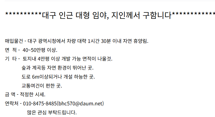 대구 인근 대형 임야 구합니다. 작성자바다랑|작성시간26.04.06|조회수18 목록 댓글 0 글자크기 작게가 글자크기 크게가 전국 토지전문카페 토지사랑모임카페 https://cafe.daum.net/tozisarang전국토지사랑 네이버밴드 https://band.us/band/67662360전국급매 부동산네이버카페https://cafe.naver.com/tozisarang 다음검색 현재 게시글 추가 기능 열기 북마크 공유하기 신고 센터로 신고 댓글 댓글 0 댓글쓰기 답글쓰기 댓글 리스트