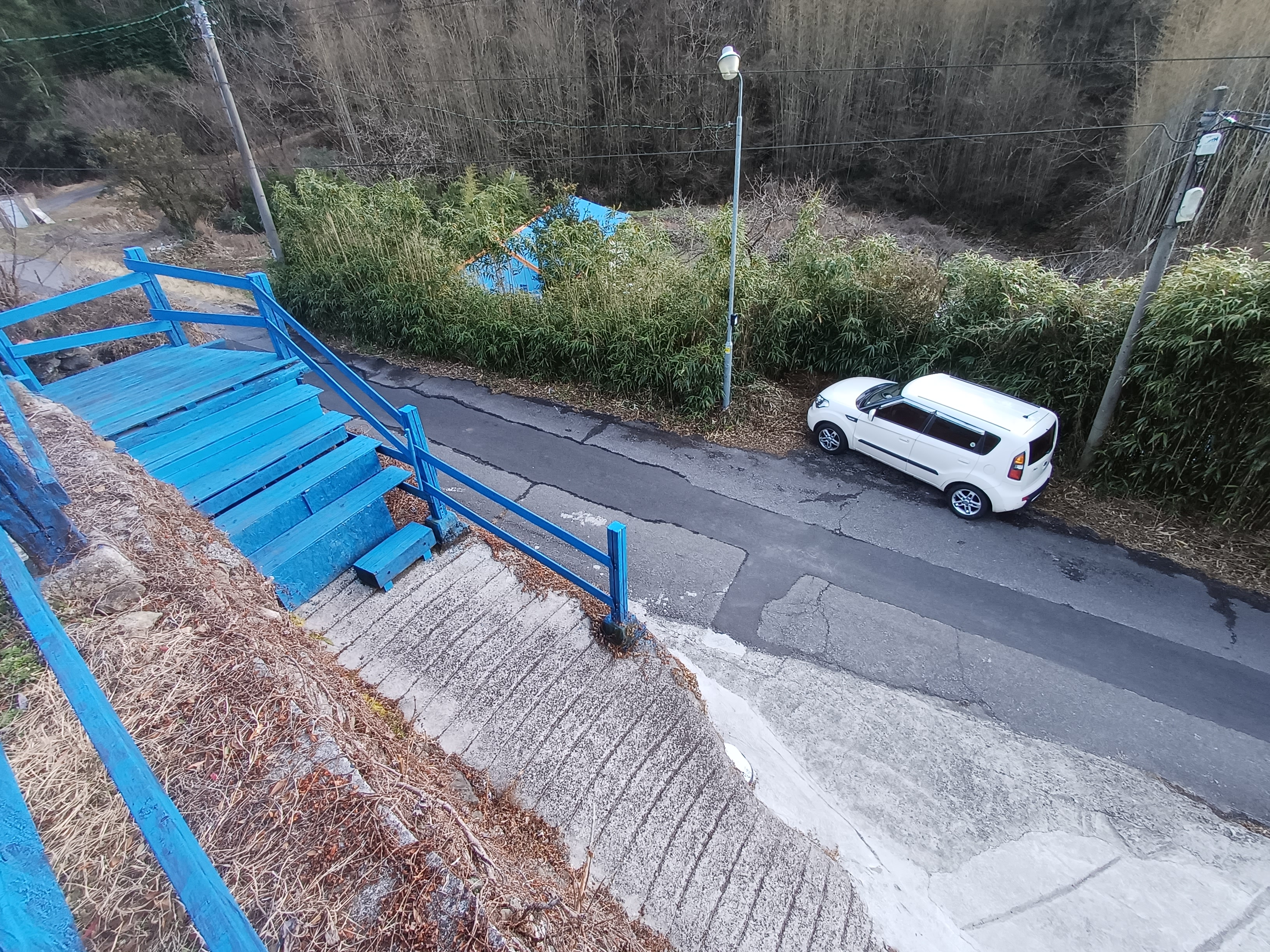 저기서 파란색 계단 5개를 올라온 후 4미터 정도 진행(도보로 5-6발)하면 대문 앞입니다