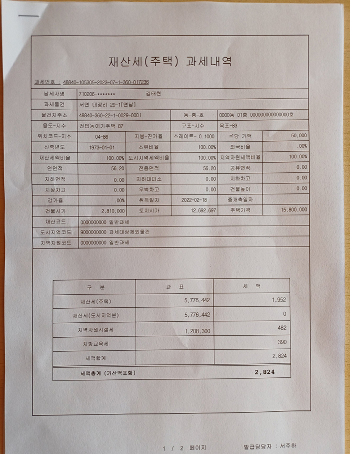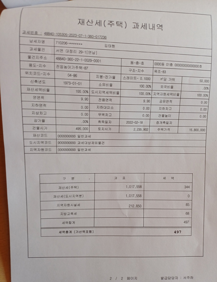주택 재산세가 2022년 6990원, 2023년 3320원입니다