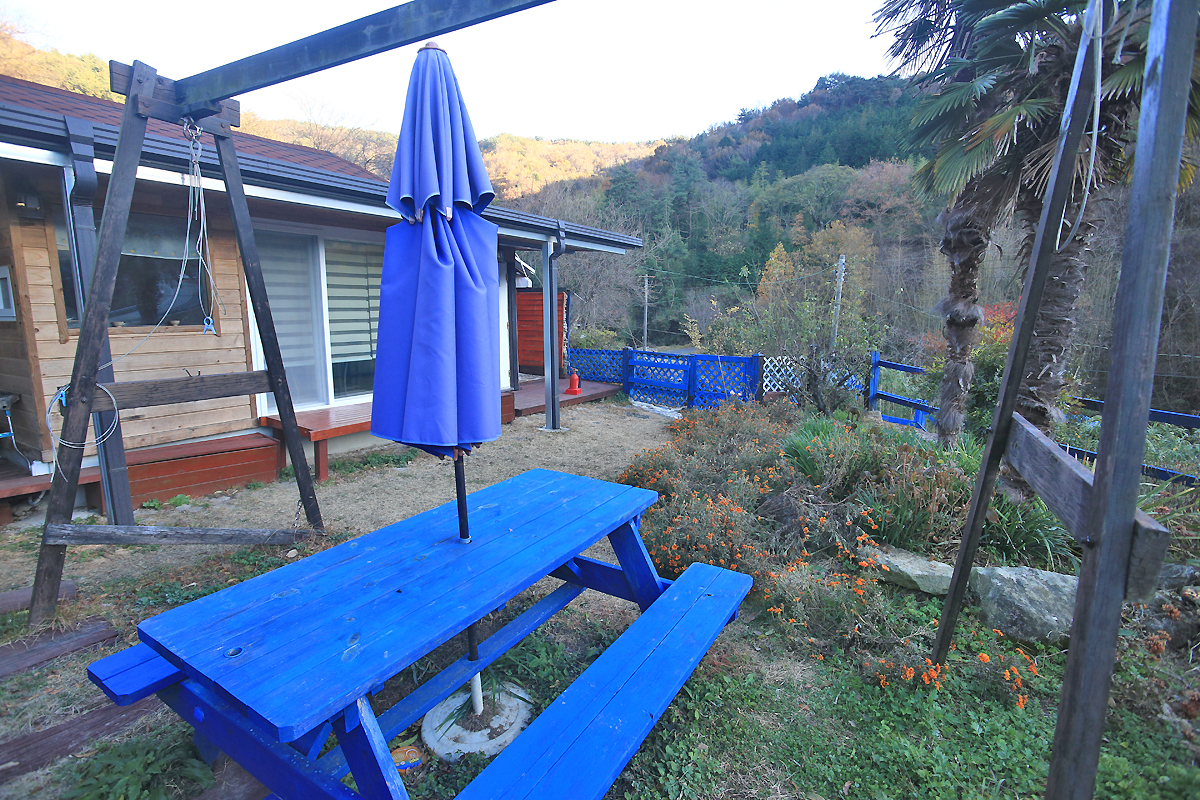잔디마당에는 6명이 앉을 수 있는 벤치와 파라솔이 있고요. 이거도 같이 드립니다.