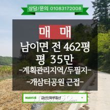 물건번호 : 2118번 금산군 남이면 성곡리 개삼터공원 계획관리지역 (개삼터공원옆) 전 462평 (두필지) 매매금액은 평당 35만원 금산부동산/금산군토지/성곡리 금산읍에서 약 10분거리 진악산 동측자락 인삼의 발원지인 개삼터공원에 접해 있는 토지로 마을을 통하지 않고 비교적 넓은 도로로 편리하게 접근이 가능하고...글쓴이부자아빠의 부동산 소식|작성일자2021.04.26.