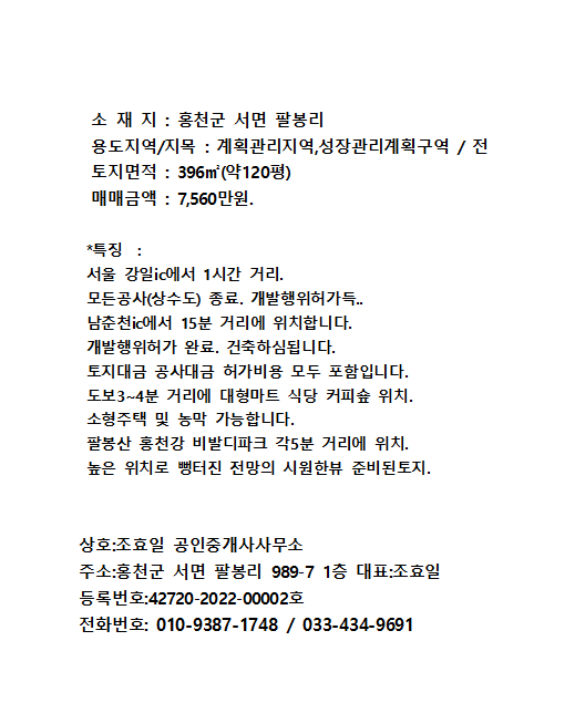 홍천 비발디파크 길목 집만지으세요 완벽공사 토지매매 120평 작성자조효일공인|작성시간26.04.06|조회수176 목록 댓글 0 글자크기 작게가 글자크기 크게가 다음검색 현재 게시글 추가 기능 열기 북마크 공유하기 신고 센터로 신고 댓글 댓글 0 댓글쓰기 답글쓰기 댓글 리스트