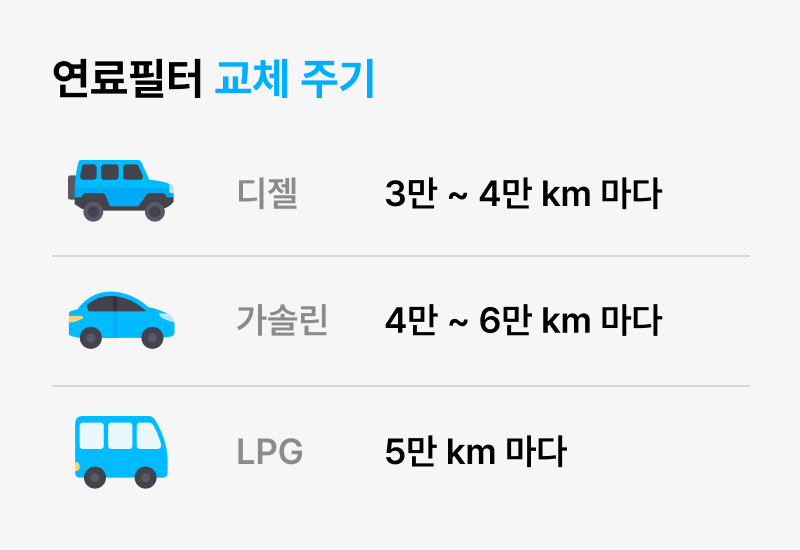 연료필터의 교환주기는 가솔린의 경우 40,000~60,000km이며 디젤은 30,000~40,000km입니다. 물론 차종에 따라 다르며 일부 가솔린 차종은 점검 주기만 매뉴얼에 나와있는 경우도 있으니, 정확한 교환주기는 내 차의 취급설명서를 확인해보세요.