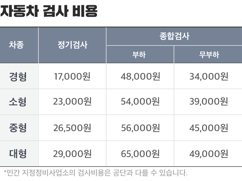 자동차 검사비용은 차종과 검사 종류에 따라 위와 같이 책정됩니다.