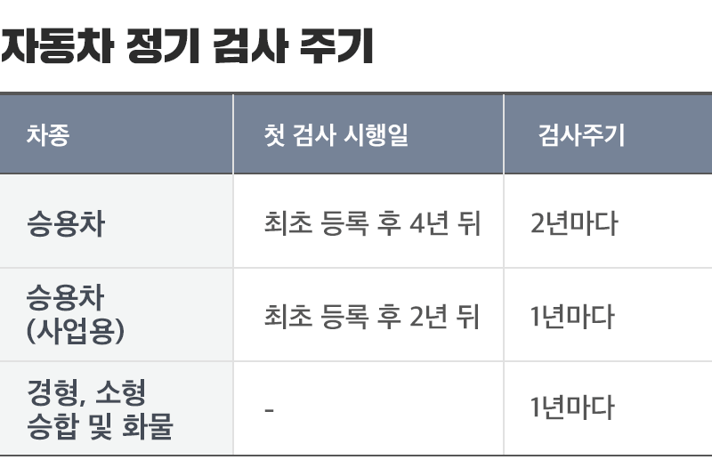 자세한 차량별 정기검사 주기는 위 표와 같습니다. 보통 일반 운전자라면 2년마다 자동차 검사를 하게 됩니다.