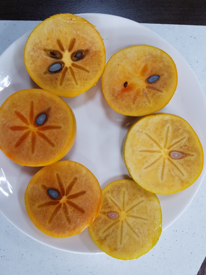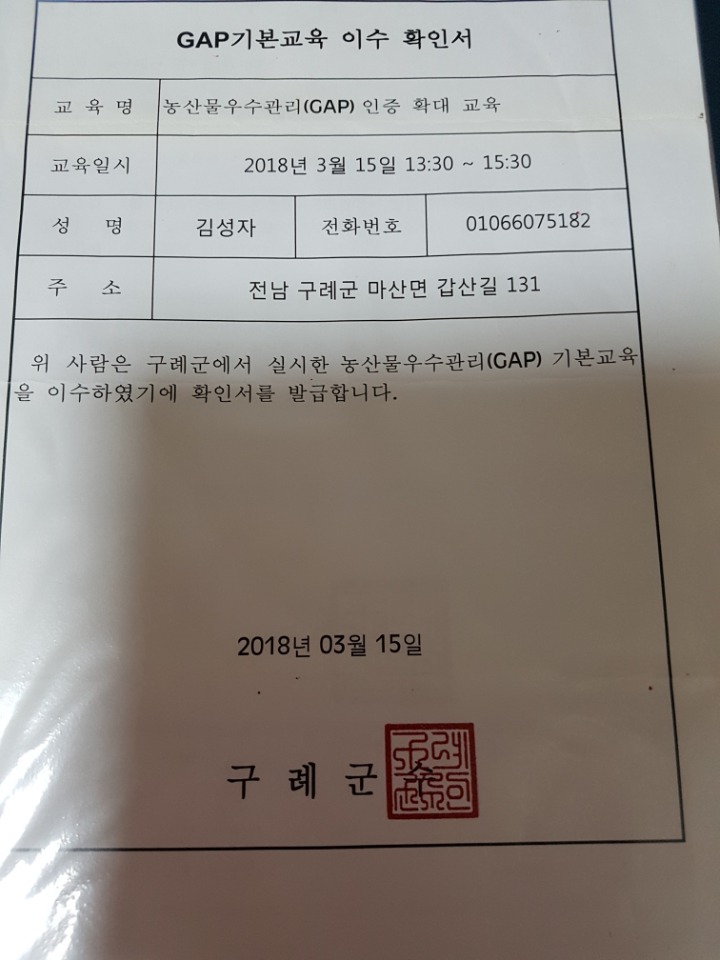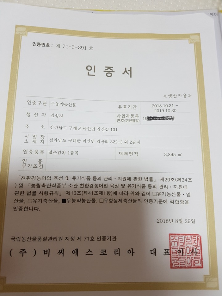 | 안녕하세요. 감이네 농장 입니다 여름에는 무더위와 가뭄, 태풍으로 인해 그나마 있던 열매에서도 46% 피해가 났어요. 농약, 제초제를 전혀 사용하지 않았어요. 그 정성을 알기라도 한듯이 다행이도 남아 있는 과실이 튼실하게 잘 커 주었습니다. 친환경 인증서가 있어서 학교 급식소로 들어가는데 단감 받으시면 봉투에 담아 김치 냉장고에 두고 드세요. 바로 먹는 것보다 냉장고에 두셨다가 드시면 숙성이 되어서 더 맛있고 아삭합니다. 이 감은 오래두고 먹을 수 있는 감으로 봉투에 담아 김치 냉장고에 넣어두면 내년 3월까지 두고 먹을 수 있습니다 . 야오끼 대봉은 10월 25일에 수확할 수 있구요.(종료) 일반 대봉 감은10월 30일 전후 작업해서 보내드릴게요. 인증서가 올해는 일찍 나왔어요. 농협 지리산장궁 영농조합 351-0721-3013-43 사업자 416-82-21211 통신판매 2015-4870053-30-2-00007호