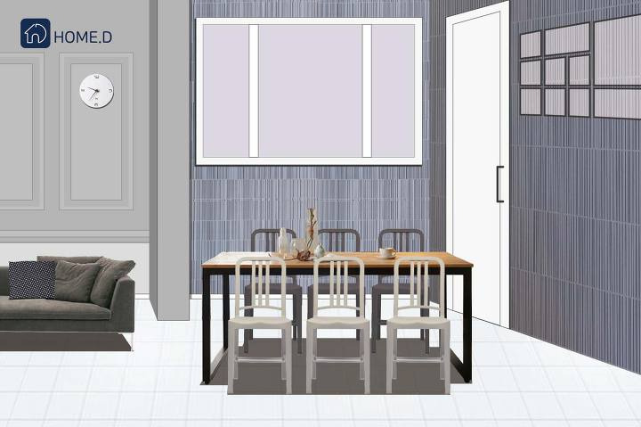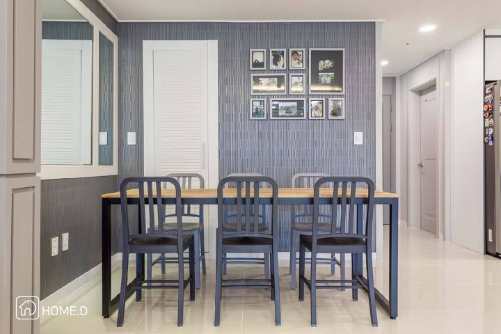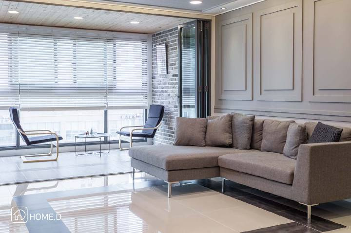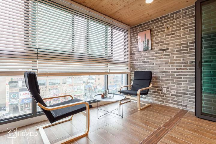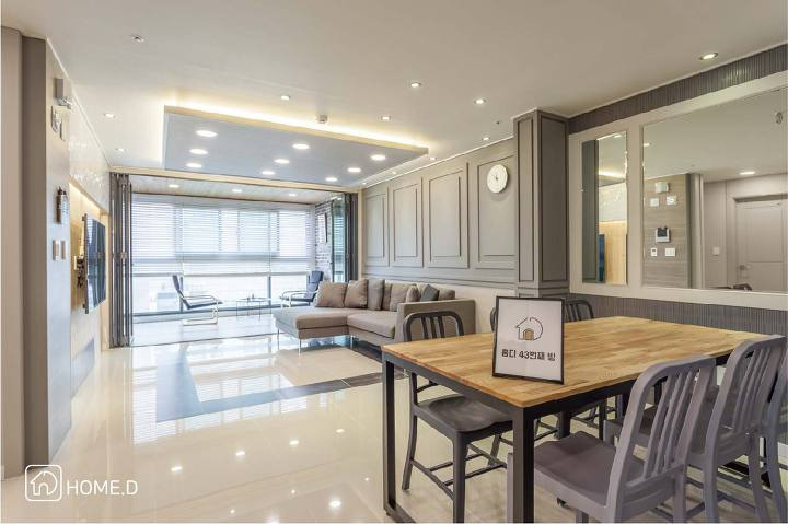 한 공간에 있는 베란다, 거실, 다이닝룸을 각각 다른 컨셉으로 제안해 드렸어요. 컨셉은 다 다르지만 전체적으로 가구와 소품을 그레이, 우드, 블랙 색상으로 통일해 드렸어요. 그리고 베란다는 신혼부부가 함께 커피 한 잔 마시면서 편안하게 얘기 나눌 수 있게 카페 분위기로 가구와 소품을 제안해 드렸어요.