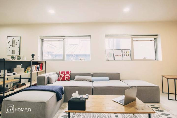 전체적인 거실 컨셉은 모던하면서도 내추럴한 스타일로 제안 드려요. 소파는 4pcs로 이루어진 섹셔널 소파로 자유롭게 배치가 가능하며, 일자로 배치하면 4M 길이의 소파를 만들 수 있습니다. 그리고 기존의 PC 테이블을 배치하고 책장은 '양면 모두 이용 가능한 책장' + '거실과의 공간을 분리할 수 있는 파티션' 역할도 충분히 가능합니다.
