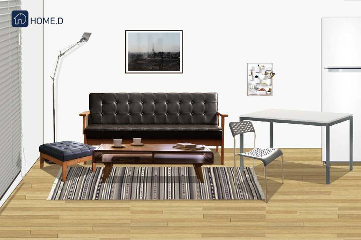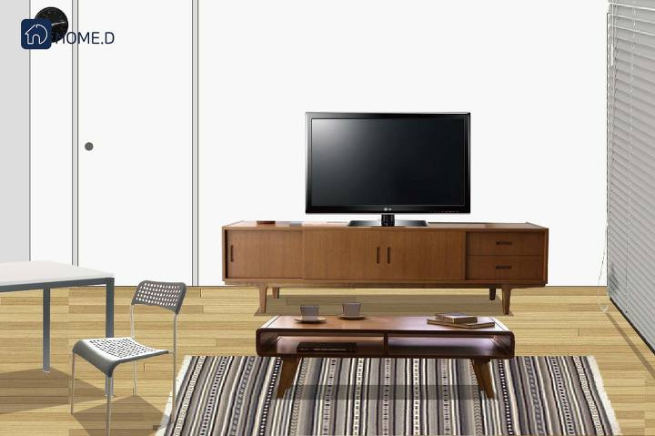 전체적으로 거실 공간의 컨셉은 빈티지 느낌으로 잡아드렸어요. 그리고 제안해드린 가구들이 전체적으로 심플하고 바닥 색상과 비슷해 다소 밋밋해 보일 수가 있어서, 바닥에는 패턴이 들어간 넓은 러그를 제안하여 바닥과 가구 사이의 밋밋함을 채워드렸어요.