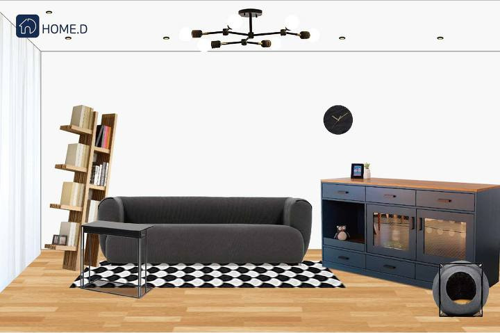주어진 예산안에서 고급스러우면서도 실용적인 가구와 소품을 선택하기 위해 노력했습니다. 특히, 소파는 같이 사는 고양이를 생각하여 고강도의 마찰력이 좋은 그리고 먼지가 적은 소재로 제안합니다. 그리고 공간을 더 넓어 보이게 하기 위해, 튼튼하되 세로 폭은 살짝 좁은 디자인의 소파를 추천드립니다.