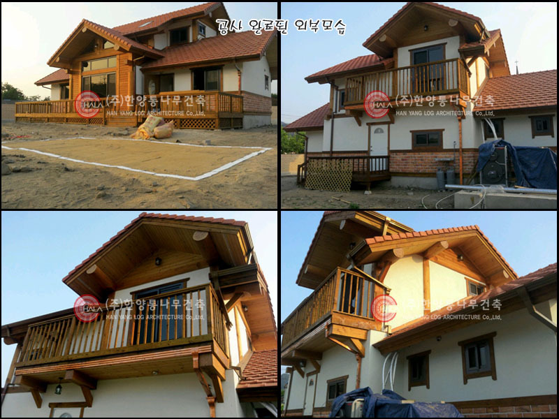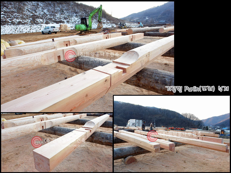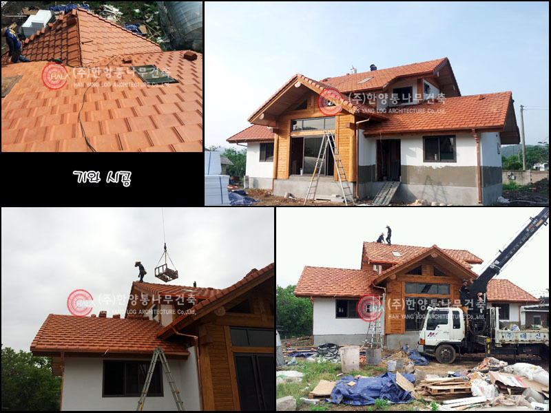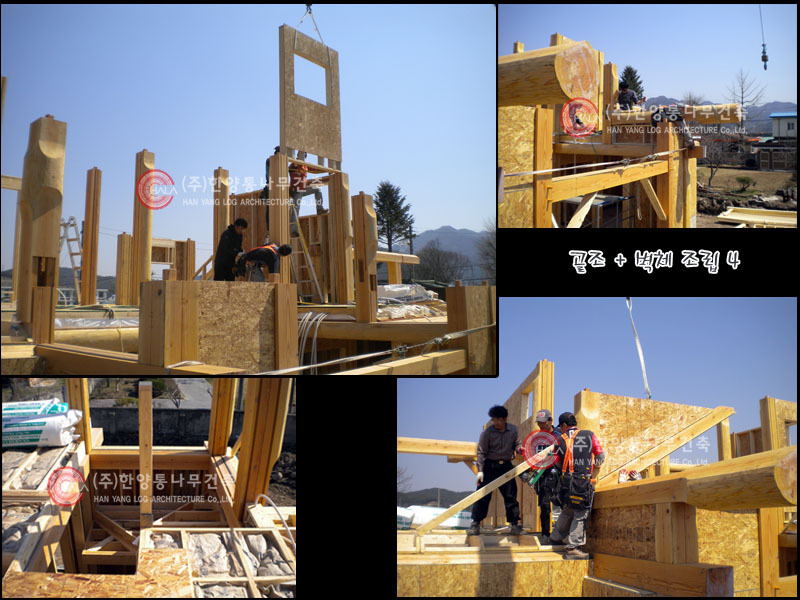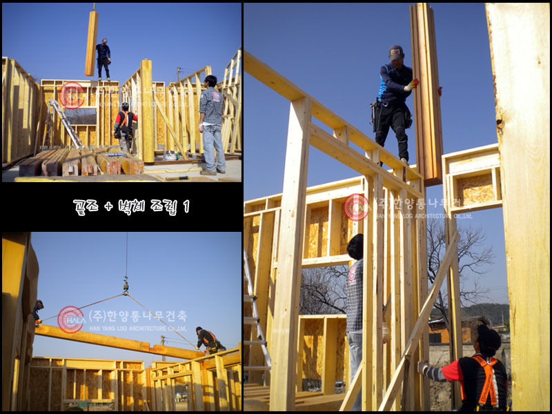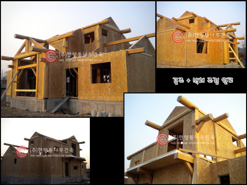 통나무골조와 경량목조벽체를 제작하여 현장으로 이동후 조립을 합니다.