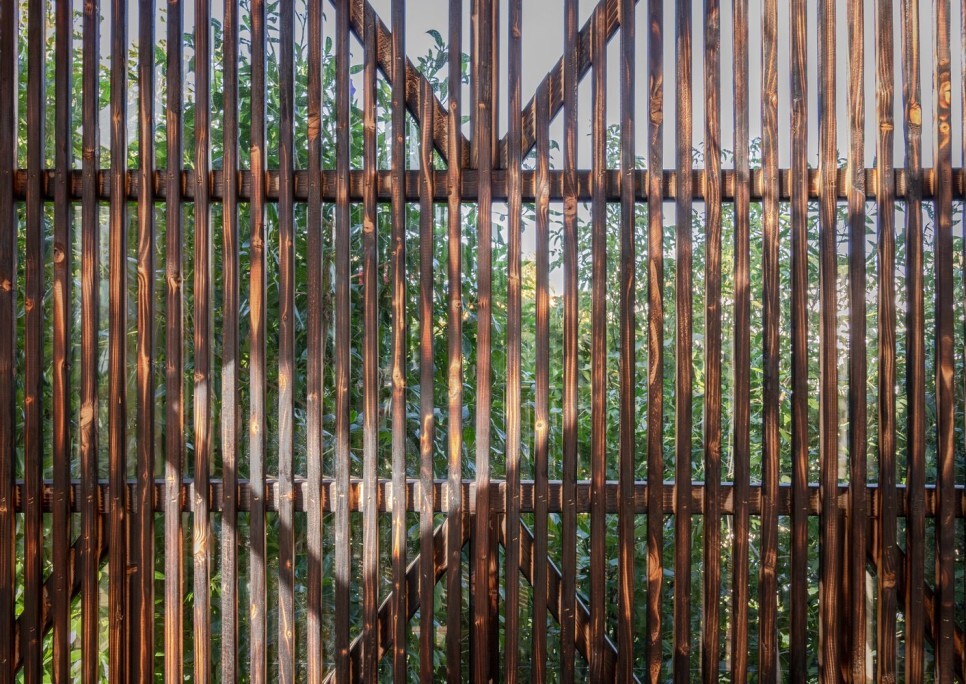 목 살대 구성으로 이루어진 은은한 느낌의 외장 파사드 연출 뷰 이다.
