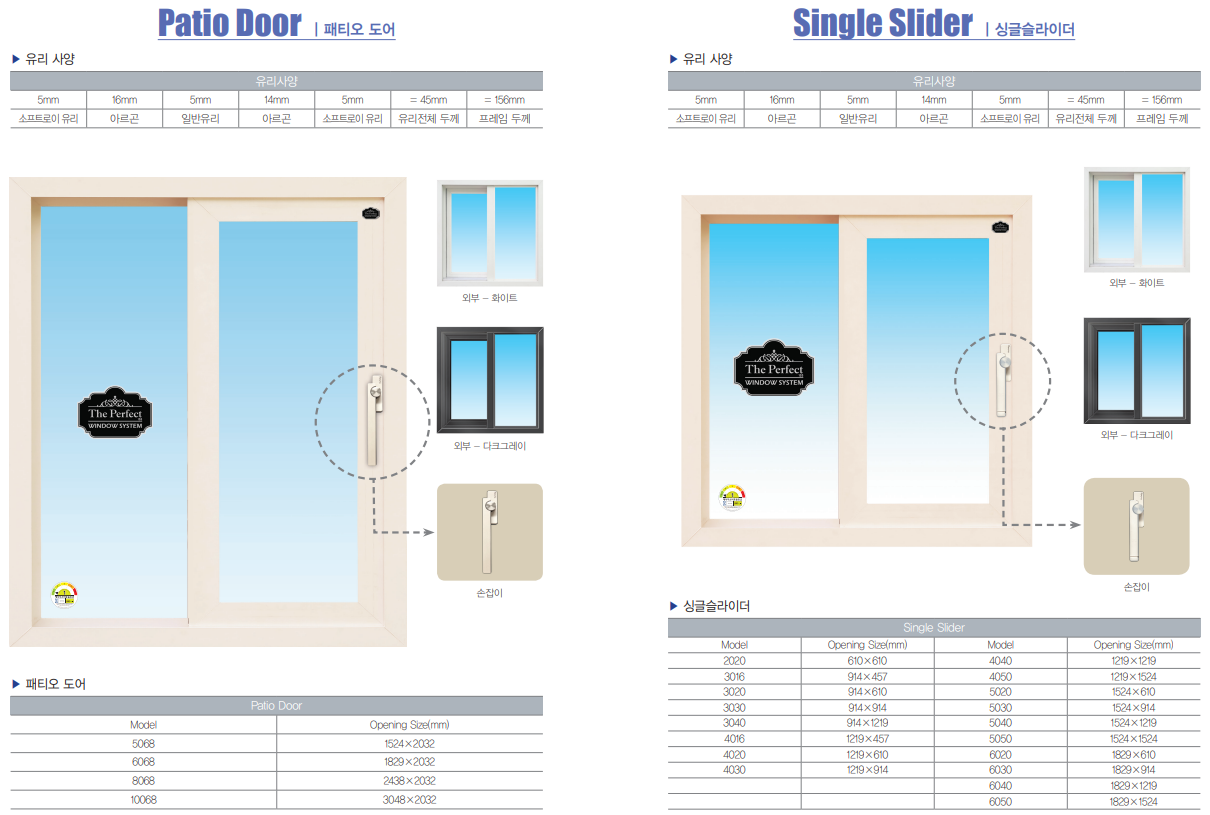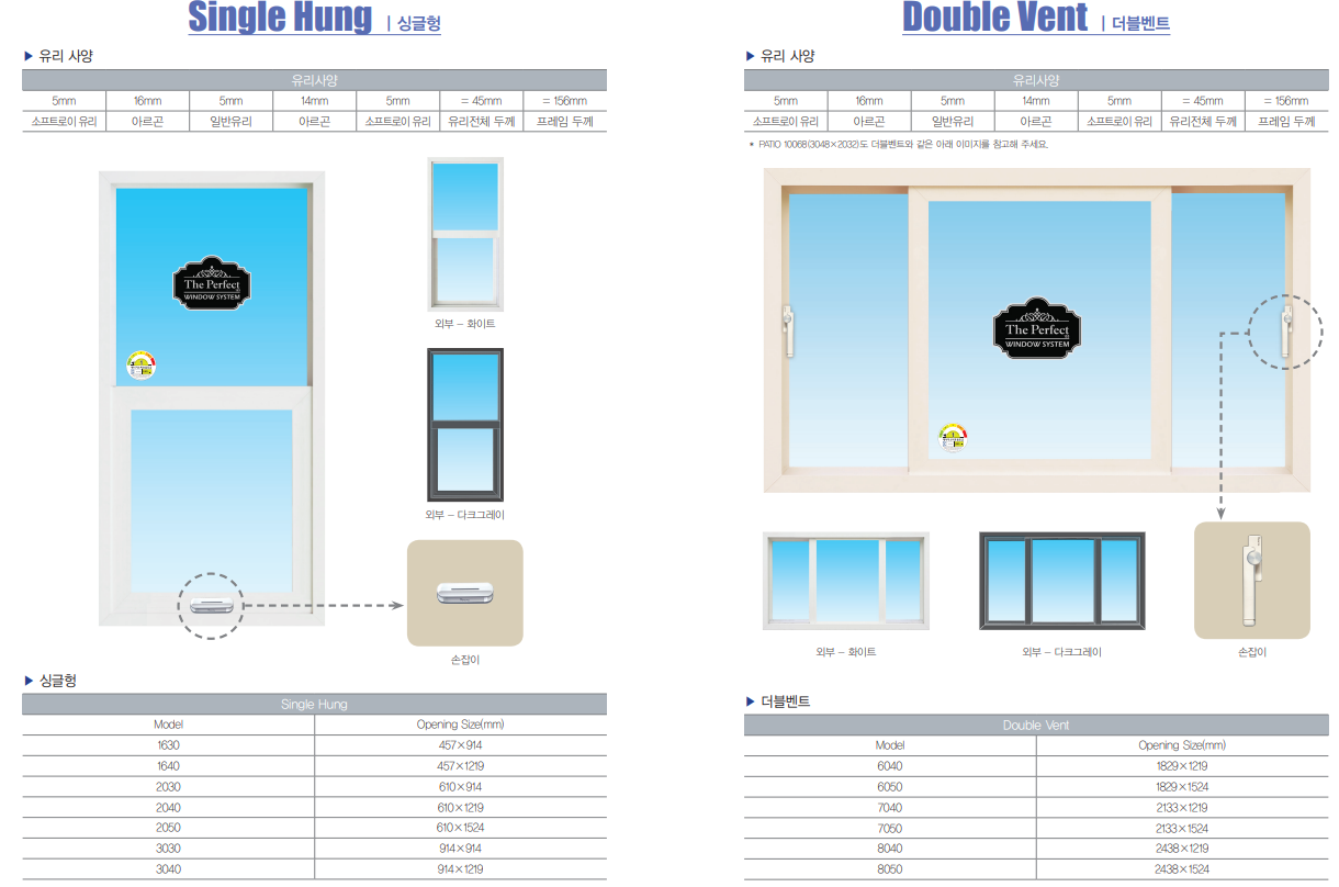 제품 안내에 따르면 국산 최고급 하드웨어와 KCC 유리, 2중 로이코팅 사양이 적용되어 성능적인 안정감을 높였습니다.