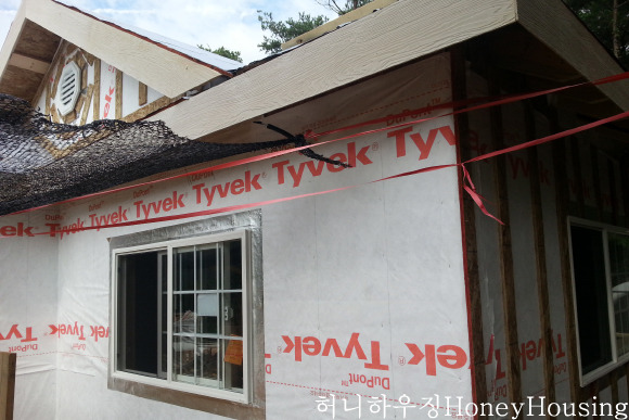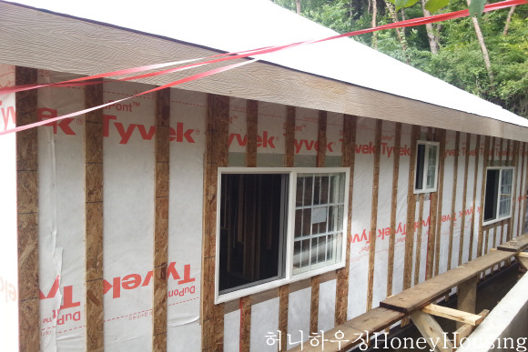 건물 외벽에 시멘트 사이딩이나 목재 사이딩으로 외부 마감을 하여 타이벡 시공후 바로 사이딩 시공을 하였습니다