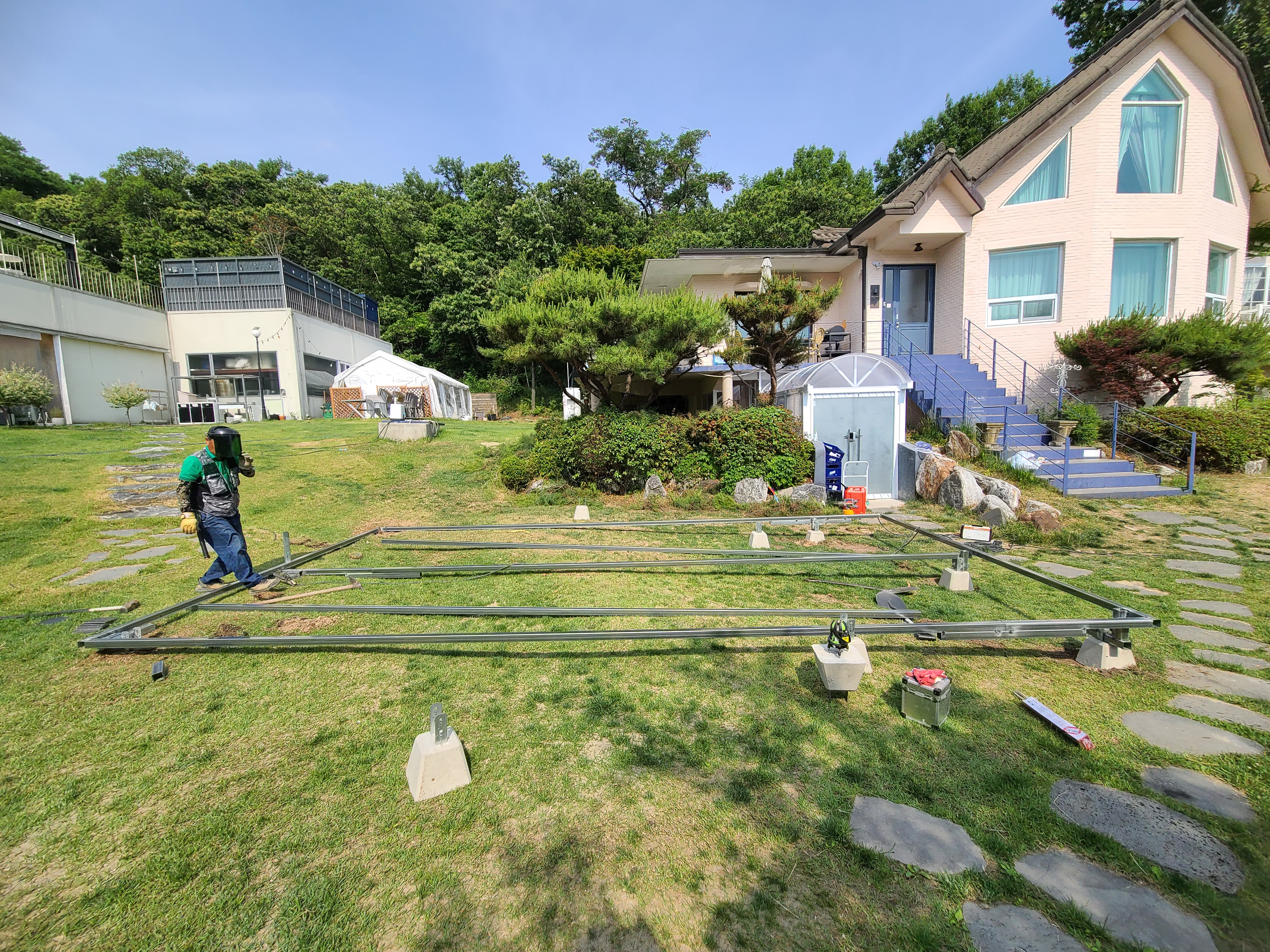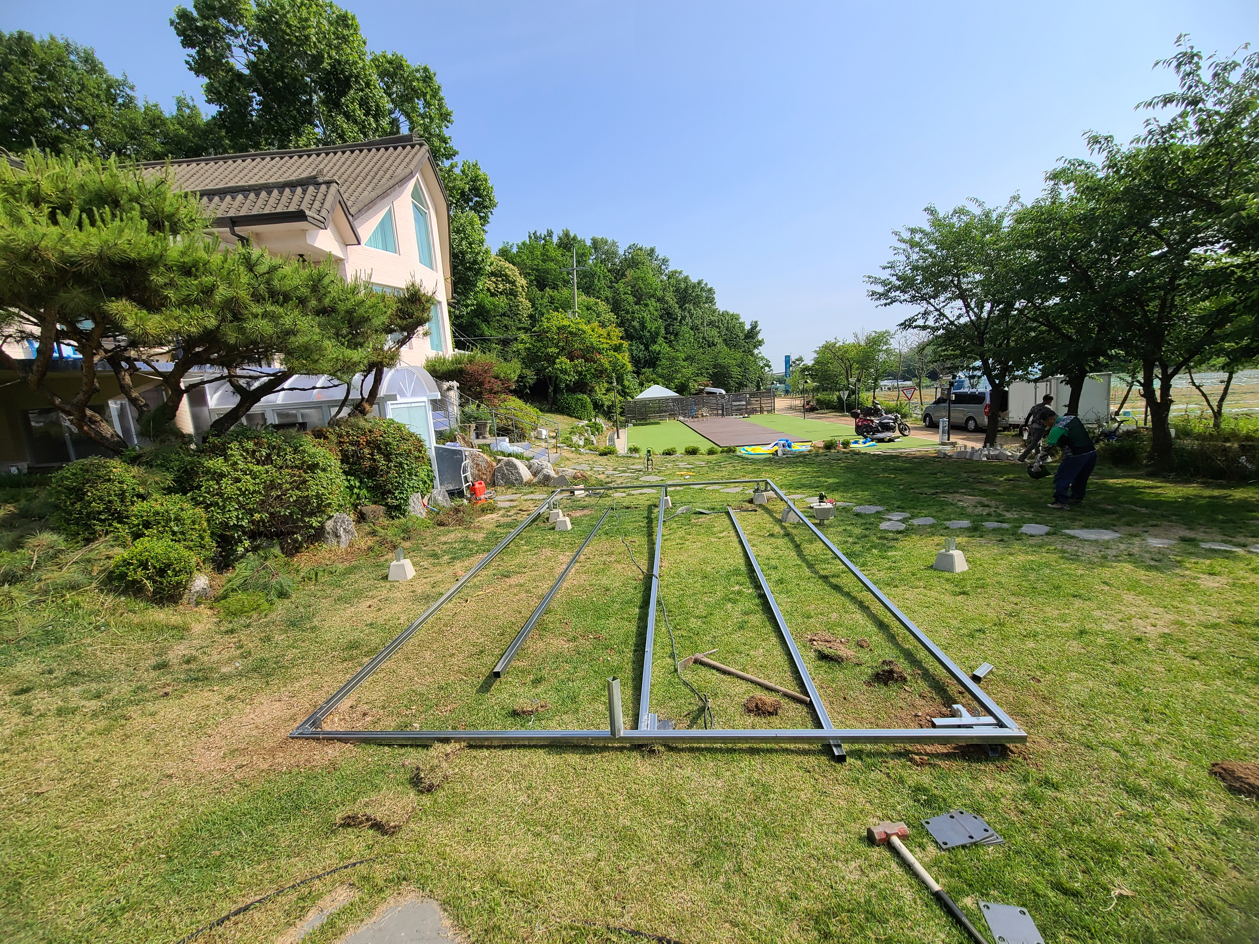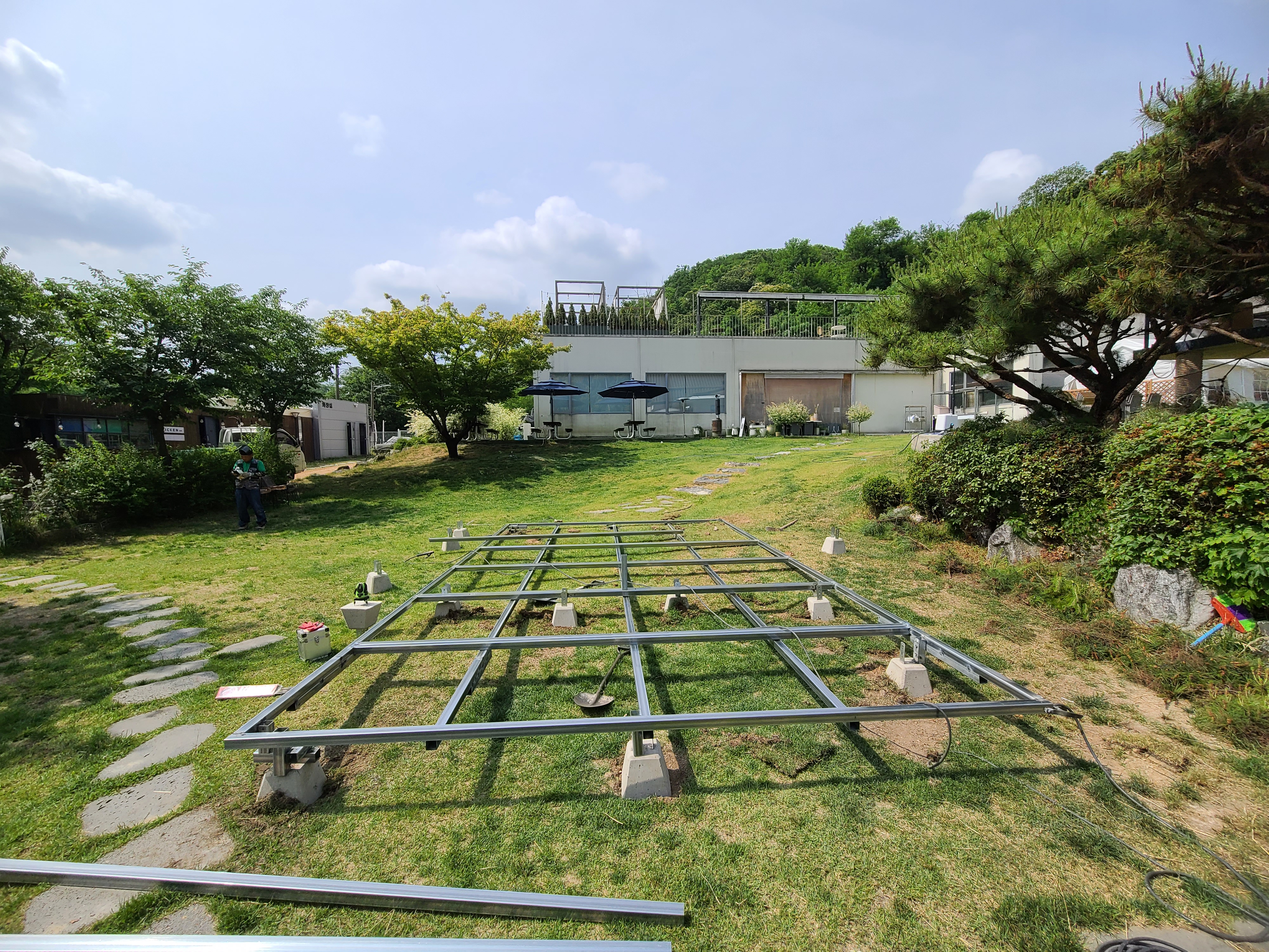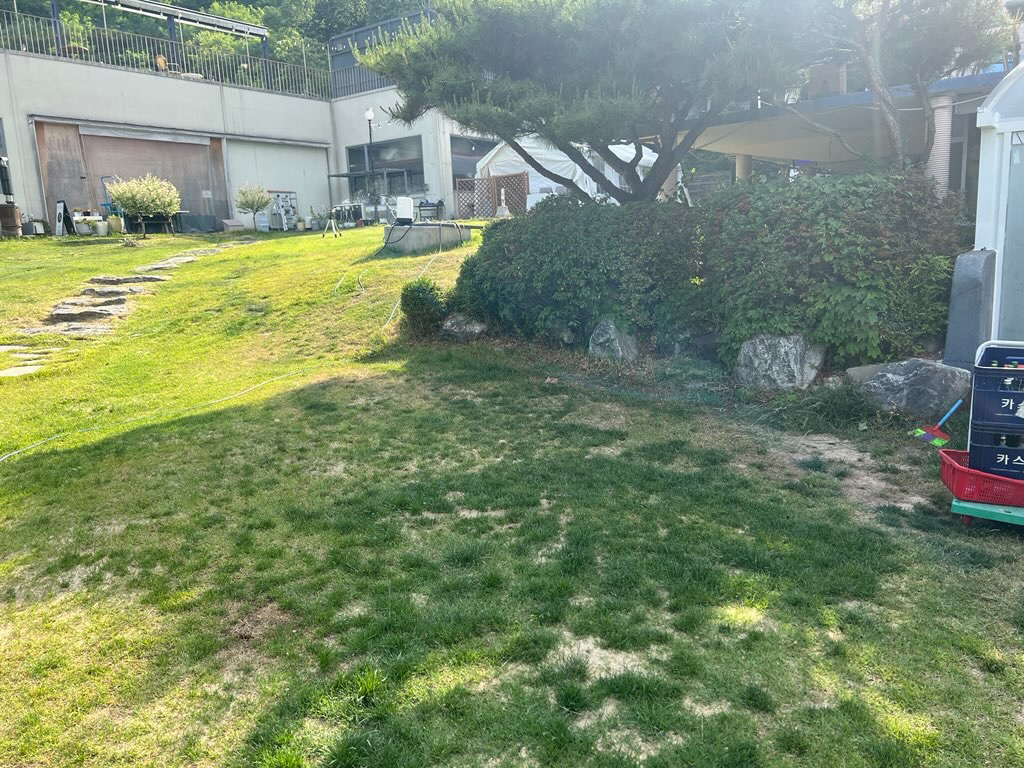 비스듬한 경사가 있는 마당이라 수평 레벨을